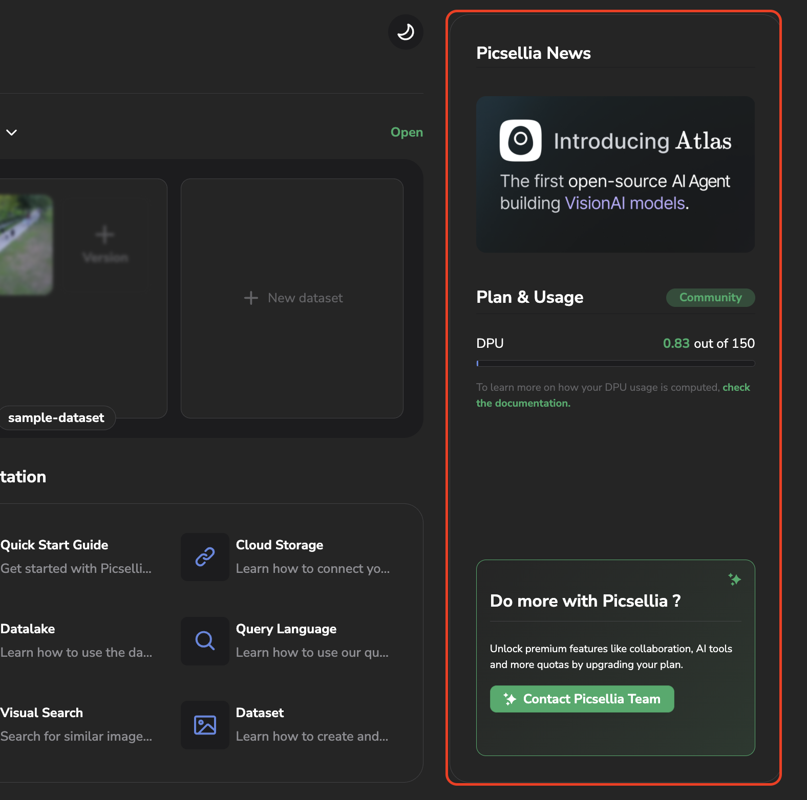 The Dashboard also embeds link to several useful documentation pieces. The listed documentation links are the main one you need to start using the main feature of Picsellia Community.