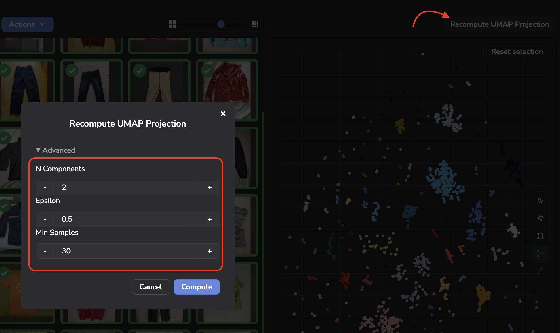 Please note that by recomputing the UMAP, you'll have the ability to set some UMAP and DBSCAN parameters as shown below: