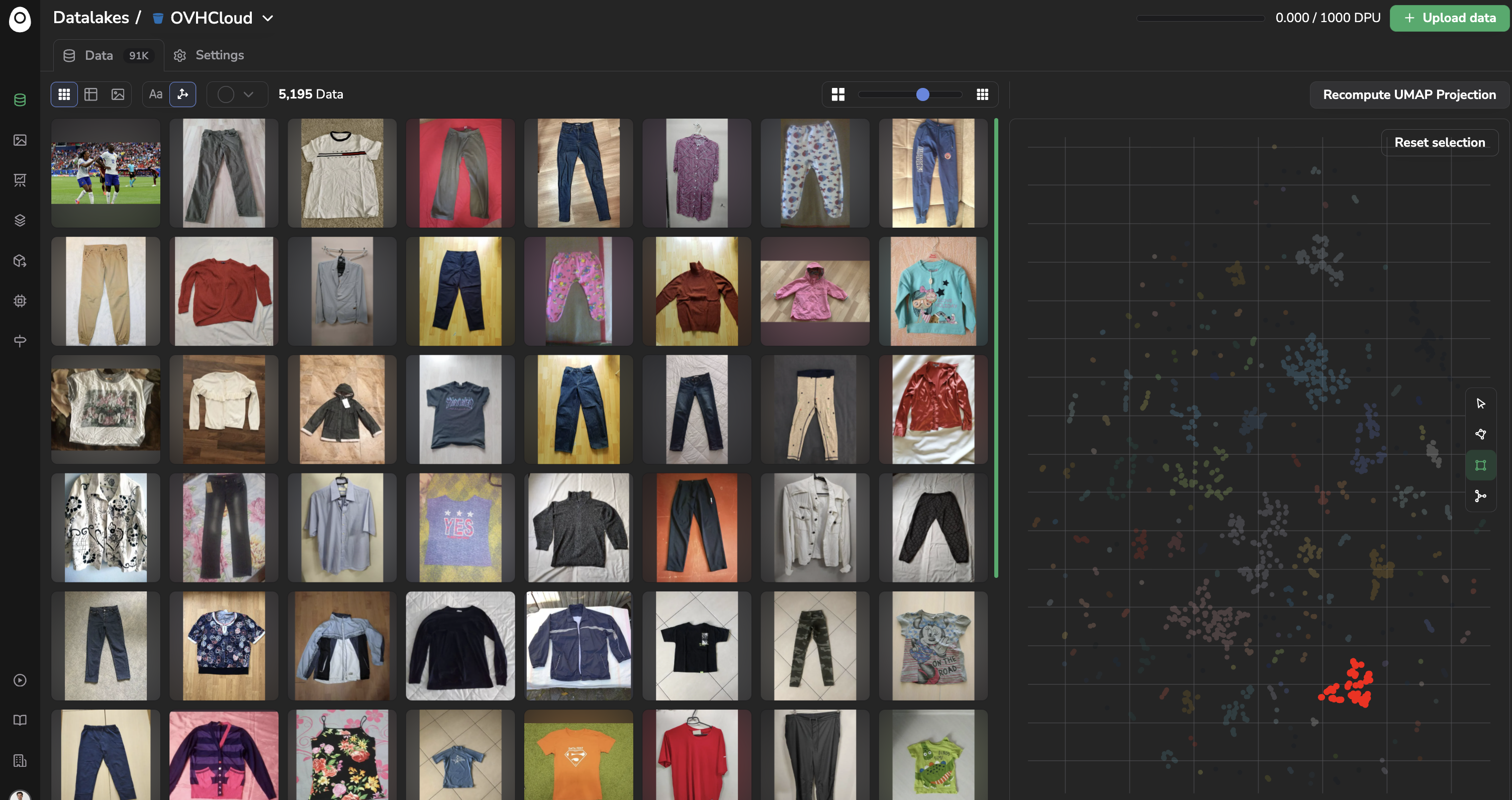The last way to leverage embeddings in your Picsellia Datalake might be the most powerfull and flexible, this one is the UMAP projection and visualisation of every embedding vector computed for the current Datalake.
