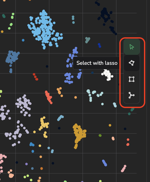 You can explore the embeddings point cloud by selecting a group of points using the polygon, rectangle or cluster tools, they will allow you selecting a bunch of points: