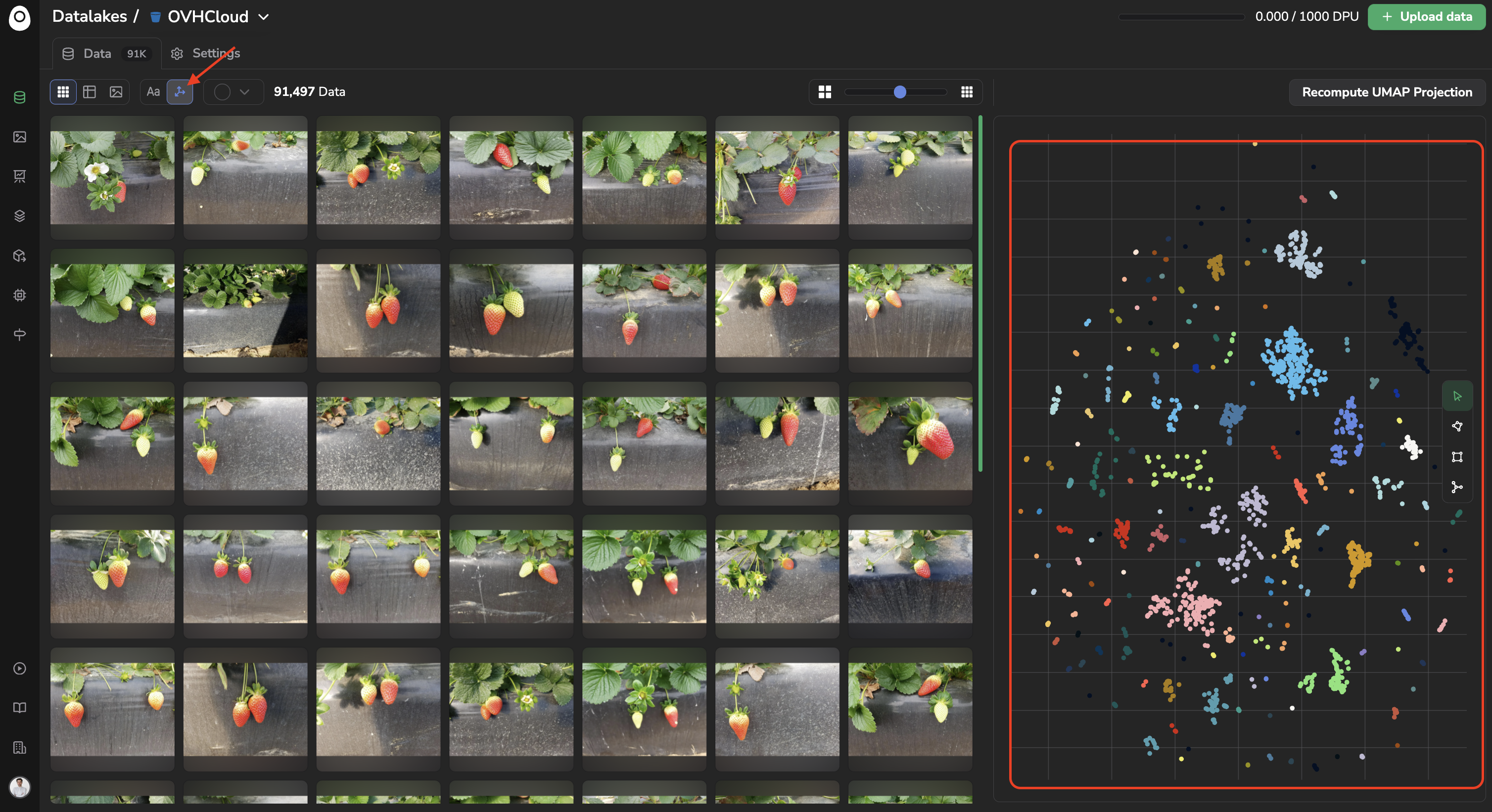Basically by cliking on the UMAP Projection button you'll access a scatter plot displaying the point cloud of all your embeddings vector computed and projected follwing the UMAP method.