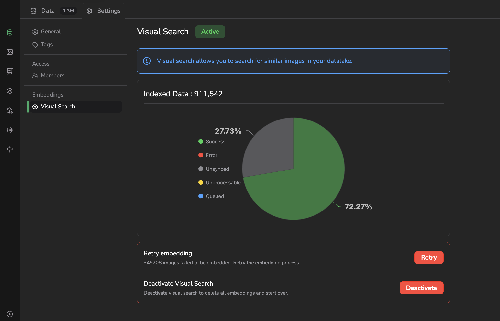 Please also note that you can deactivate the embeddings computation at any moment by clicking on Deactivate, this will, as a consequence, delete all the embeddings already computed for the current Datalake so please be very cautious while using this button.