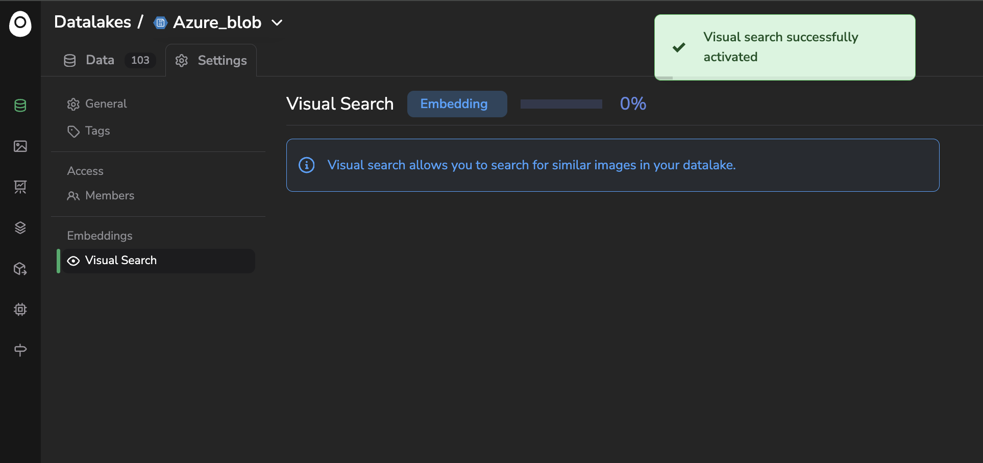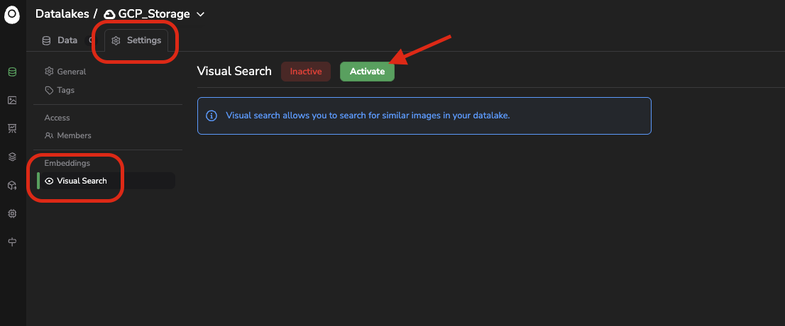 First of all before using the features that rely on the embeddings computed for your images, you need to activate this computation. To do so, you need to access the Datalake settings, especially the Visual Search tab and click on Activate: