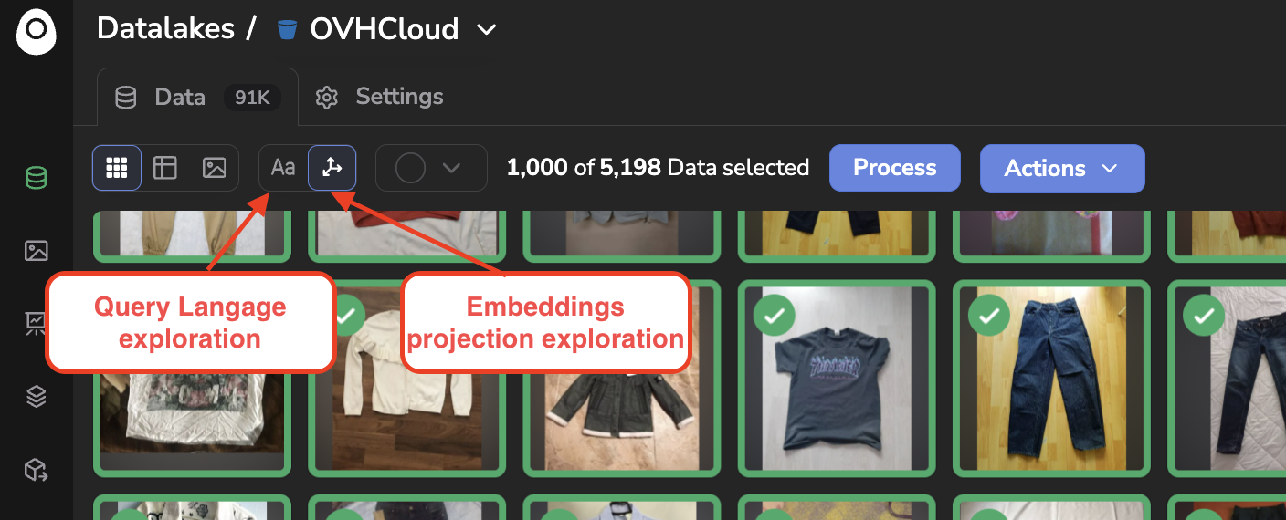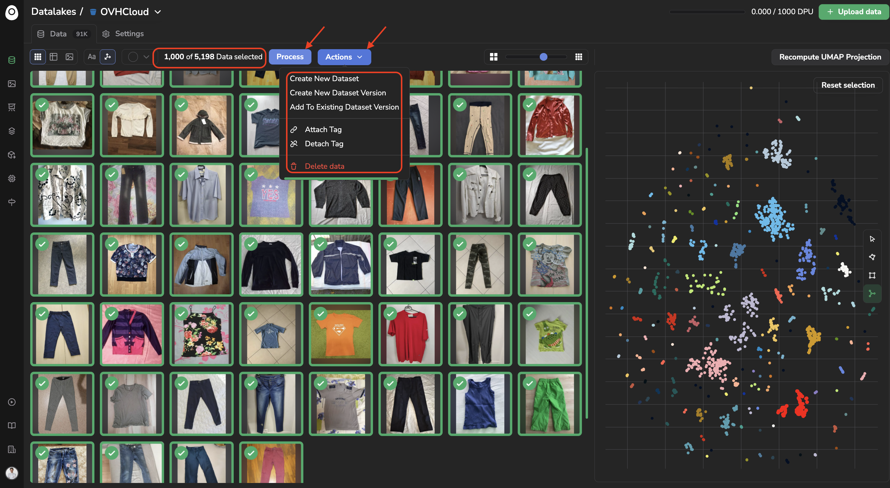 Nevertheless, once images have been filtered with the embedding exploration tools, they can be selected to get tagged, processed with a Datalake Processing or used to create a new DatasetVersion. You simply need to select the images and use the Process or Actions buttons as shown below: