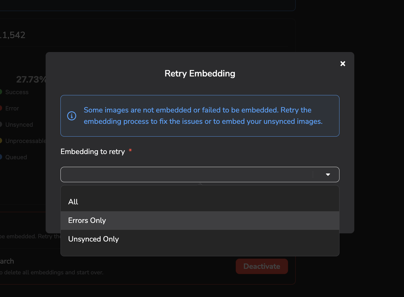 As it is the case in the above screenshot, it happens that some images can not be computed, either due to an isolated issue during the computation process or because some images are not in a format that is handled. In both cases, you can relaunch the embeddings computation for all the images that are in a given status using the Retry button: