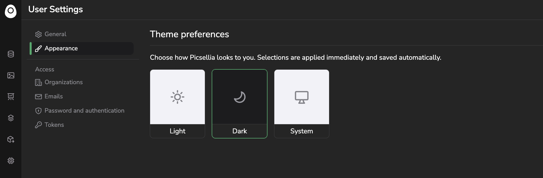 The appearance tab allows to switch between Light and Dark mode.