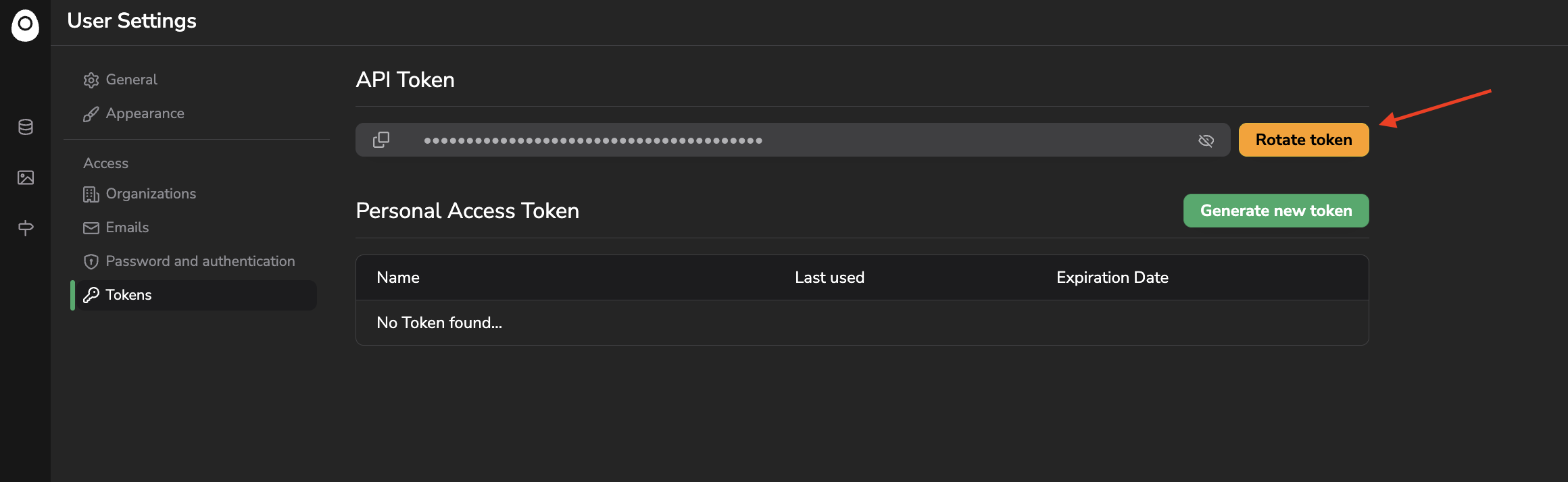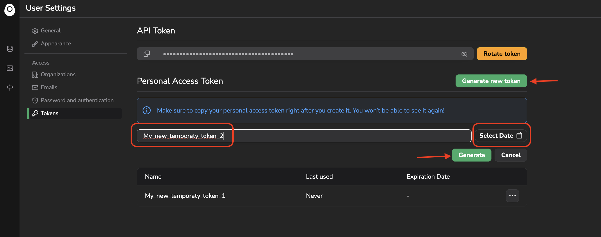 In addition of your main API Token, you can also generate additional temporary tokens. This can be done by clicking on Generate new token, prompting its name and an expiration date.