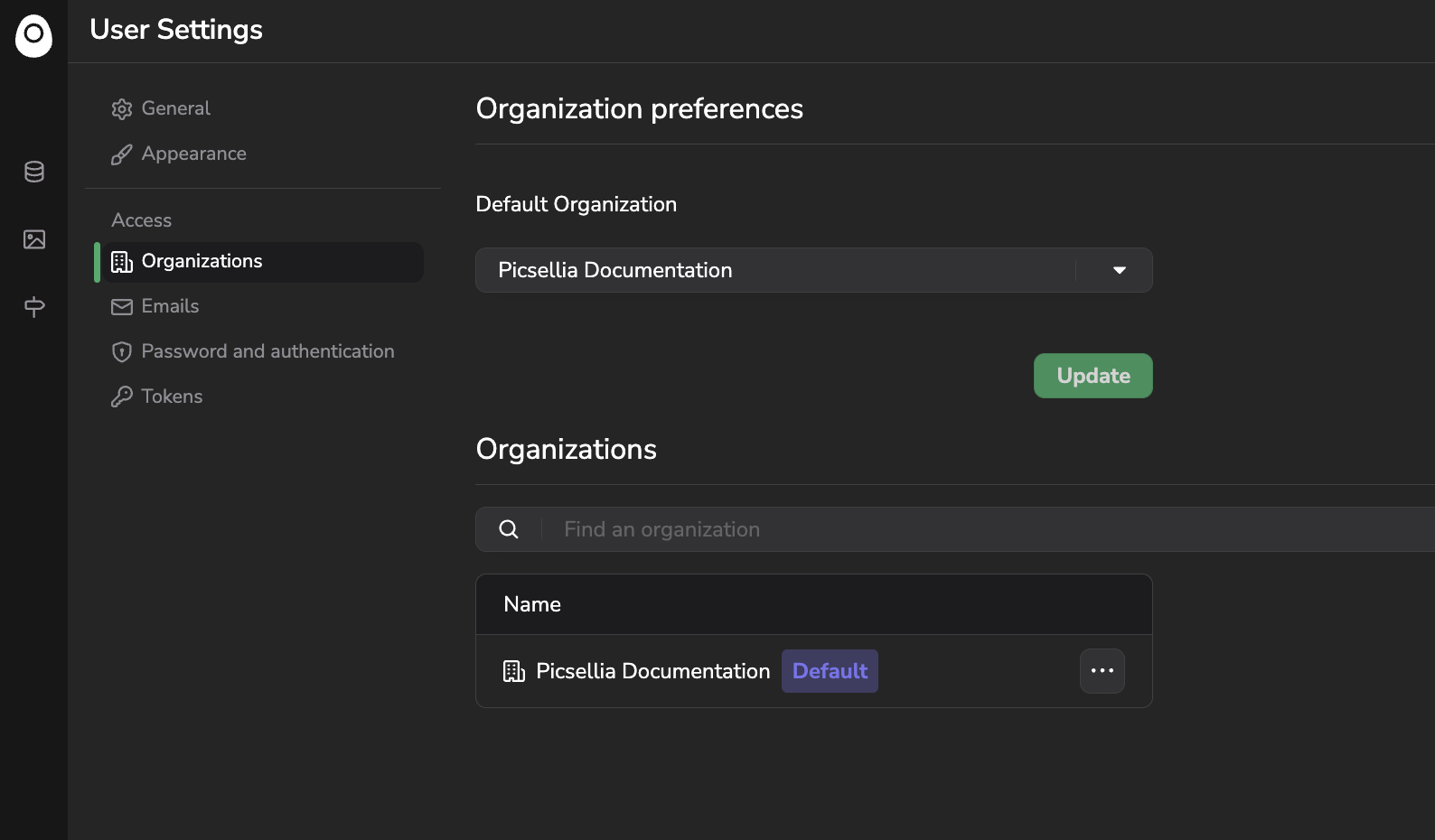 The Organization preferences tab allows you tho select the Default Organization, meaning the Organization you will always access first right after logging to Picsellia. It is highly recommended to define properly this one with the Organization in which you will develop and operate your models alongs with you team. This Organization will be used as default value for the Python SDK for instance.