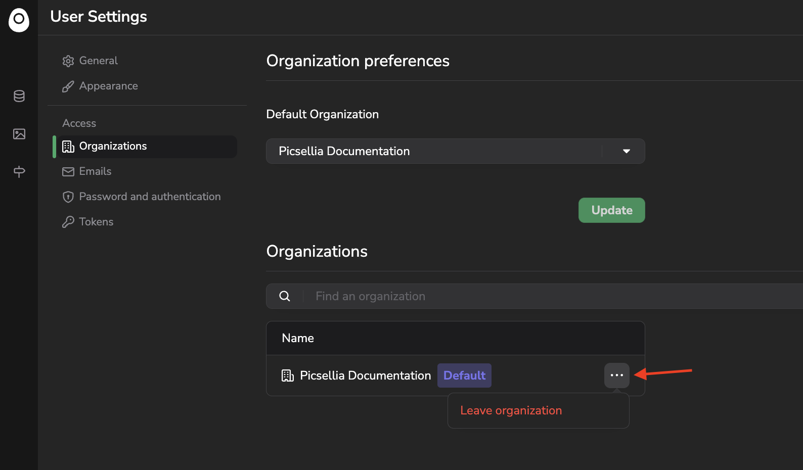 By clicking on the "..." button you'll be able to leave any Organization, except the ones you are listed as Owner