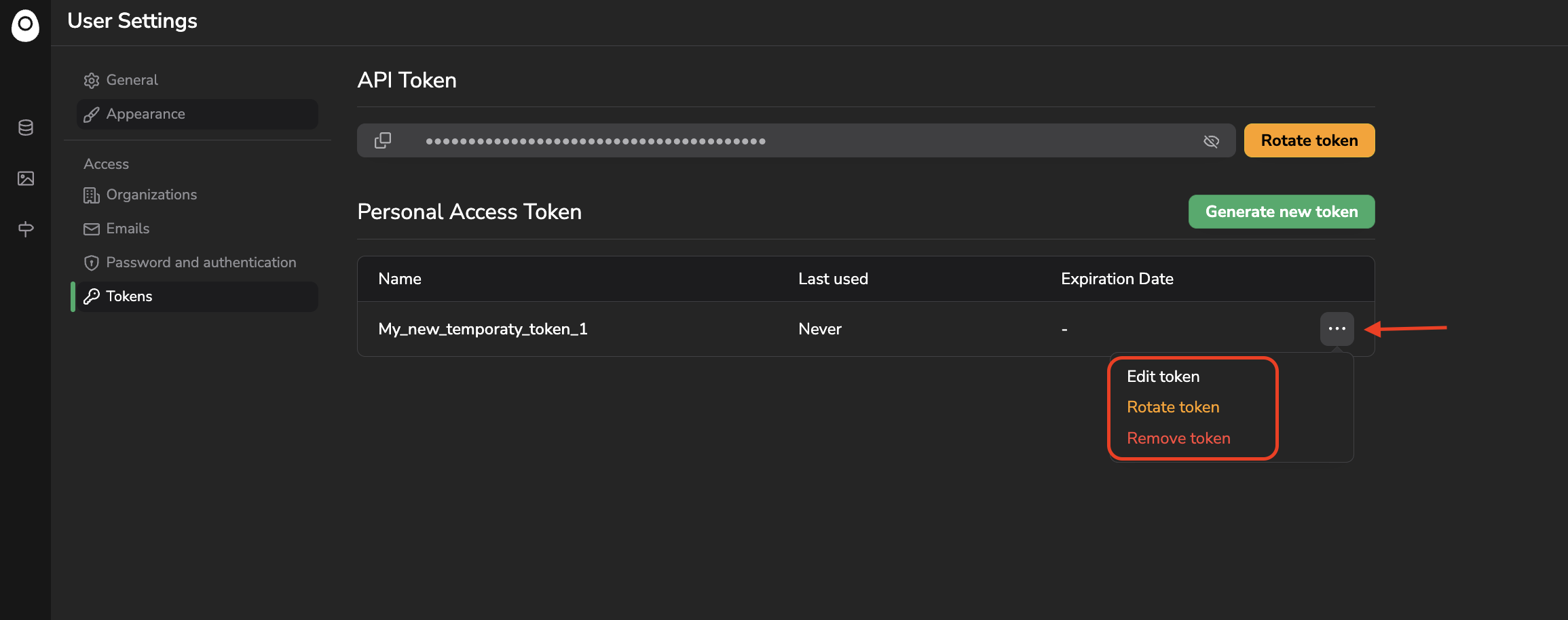 Once created, a temporary token can be edited (Name and Expiration Date), rotated or removed as shown below:
