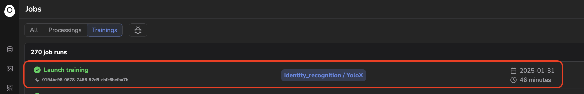 . Both public and user-created processings can be accessed in the Jobs tab. - Trainings: These are model training completed on Picsellia's infrastructure. Both public models and user-imported models and training scripts can be accessed in the Jobs tab.