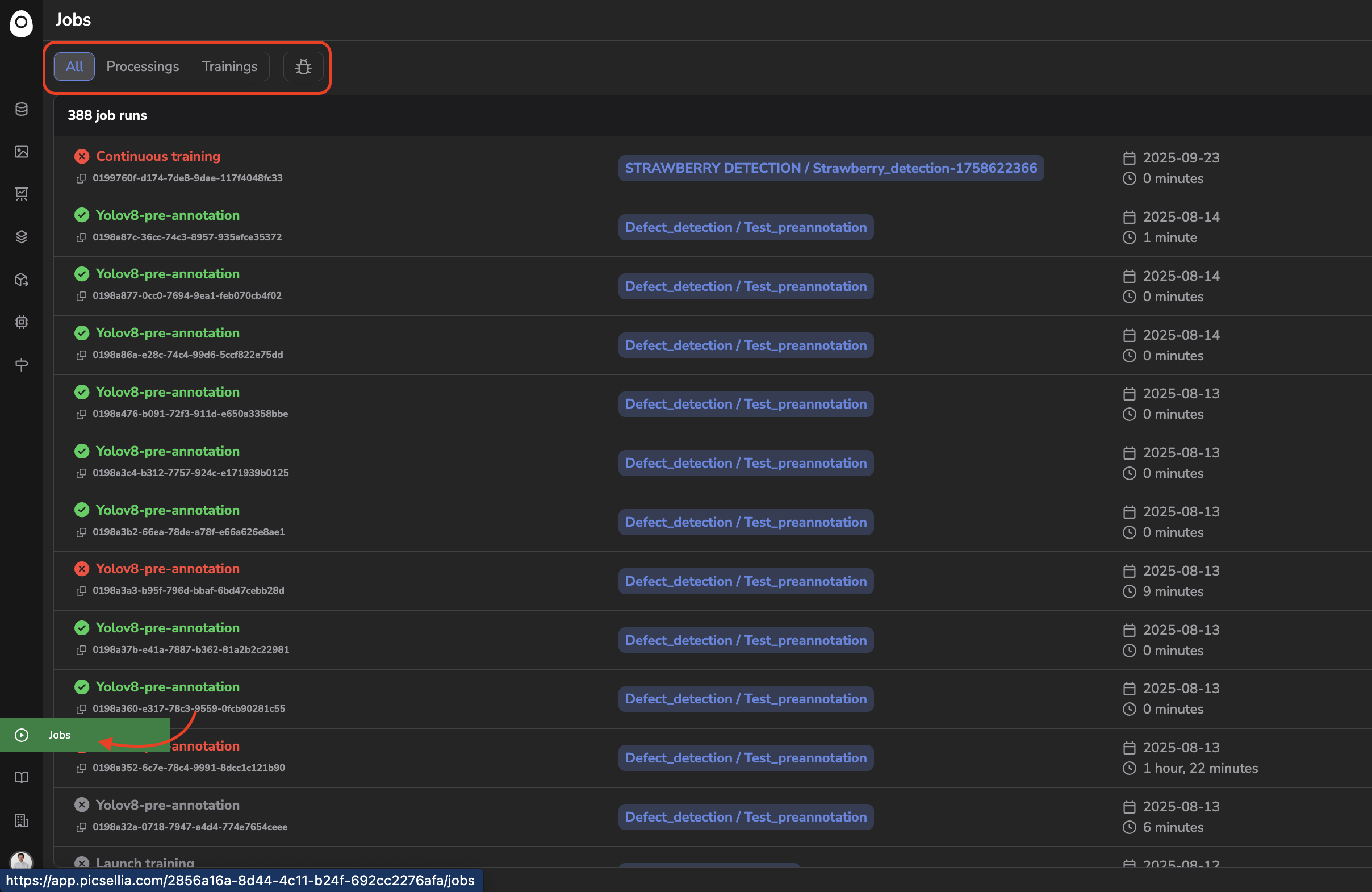 , you can use the Jobs tab to track their progress and access related logs. There are three types of Picsellia Job
