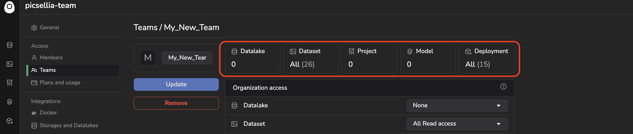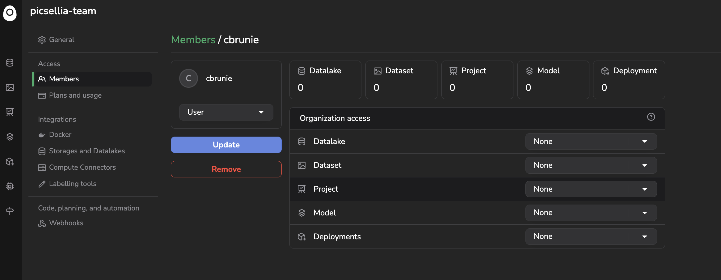 - A Member with an User Organization Right will also be able to create any of these Picsellia resources. For each resource type, the access rights can be edited in the Organization Access table. The User Organization right doesn't provides the access to the Organization Settings tab.