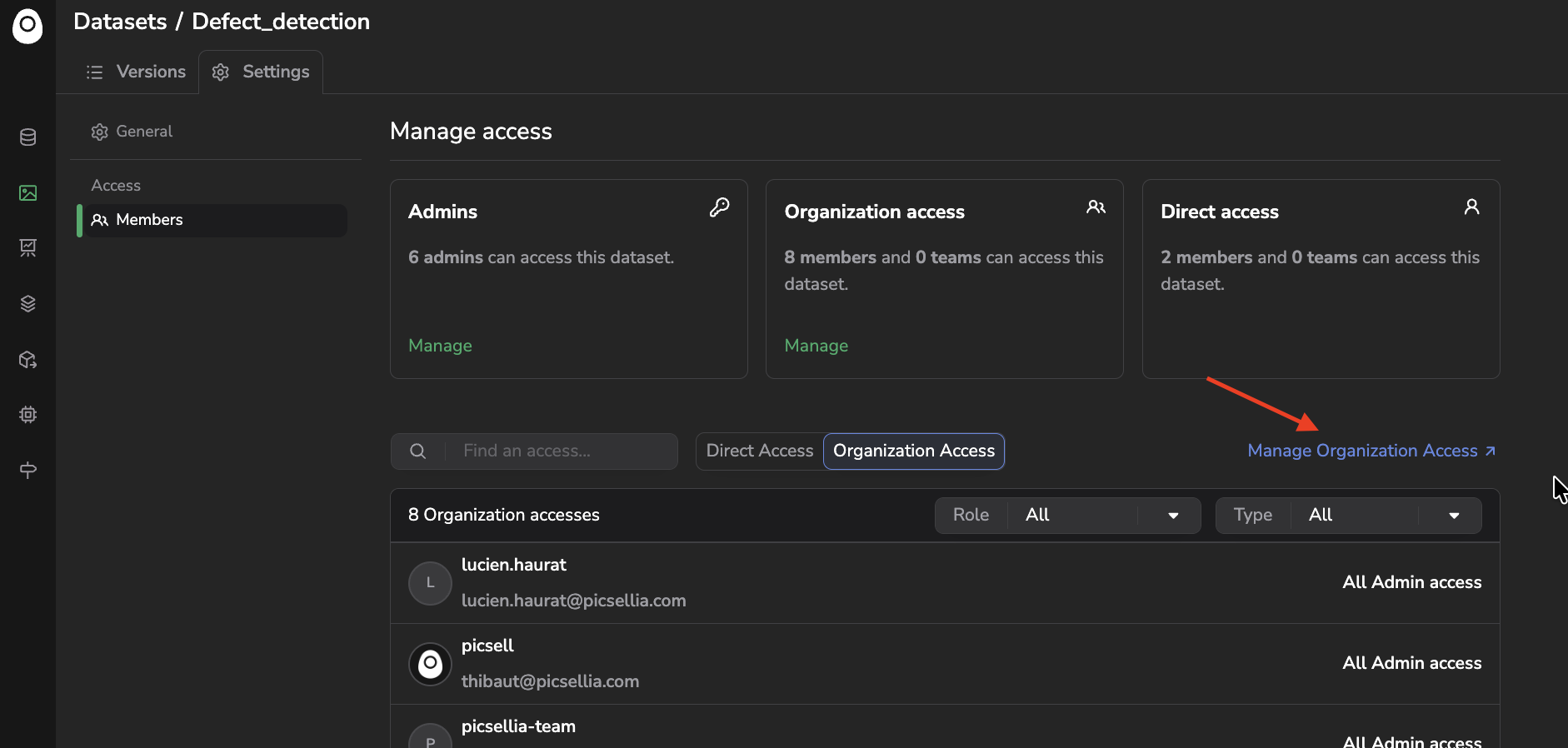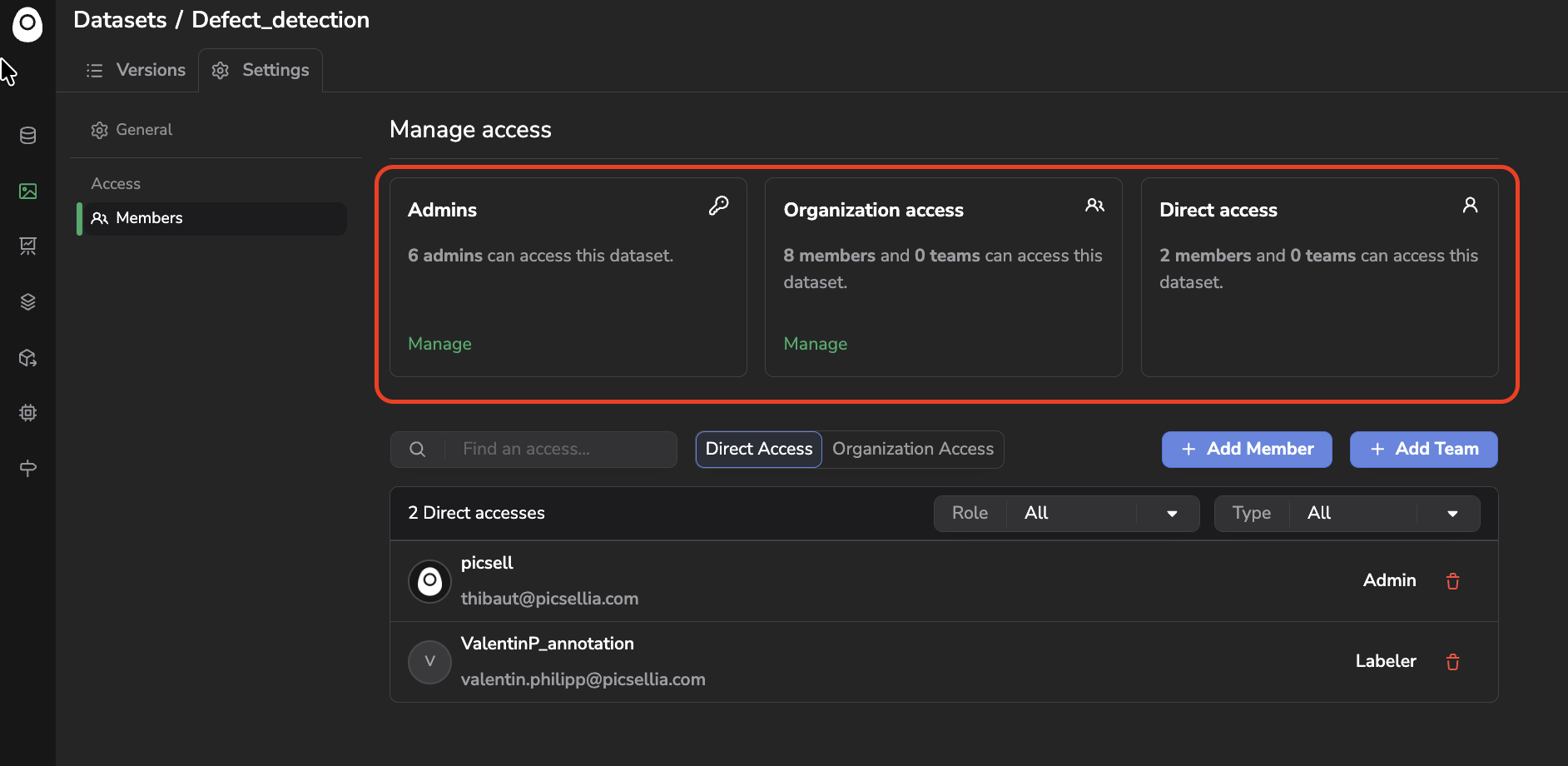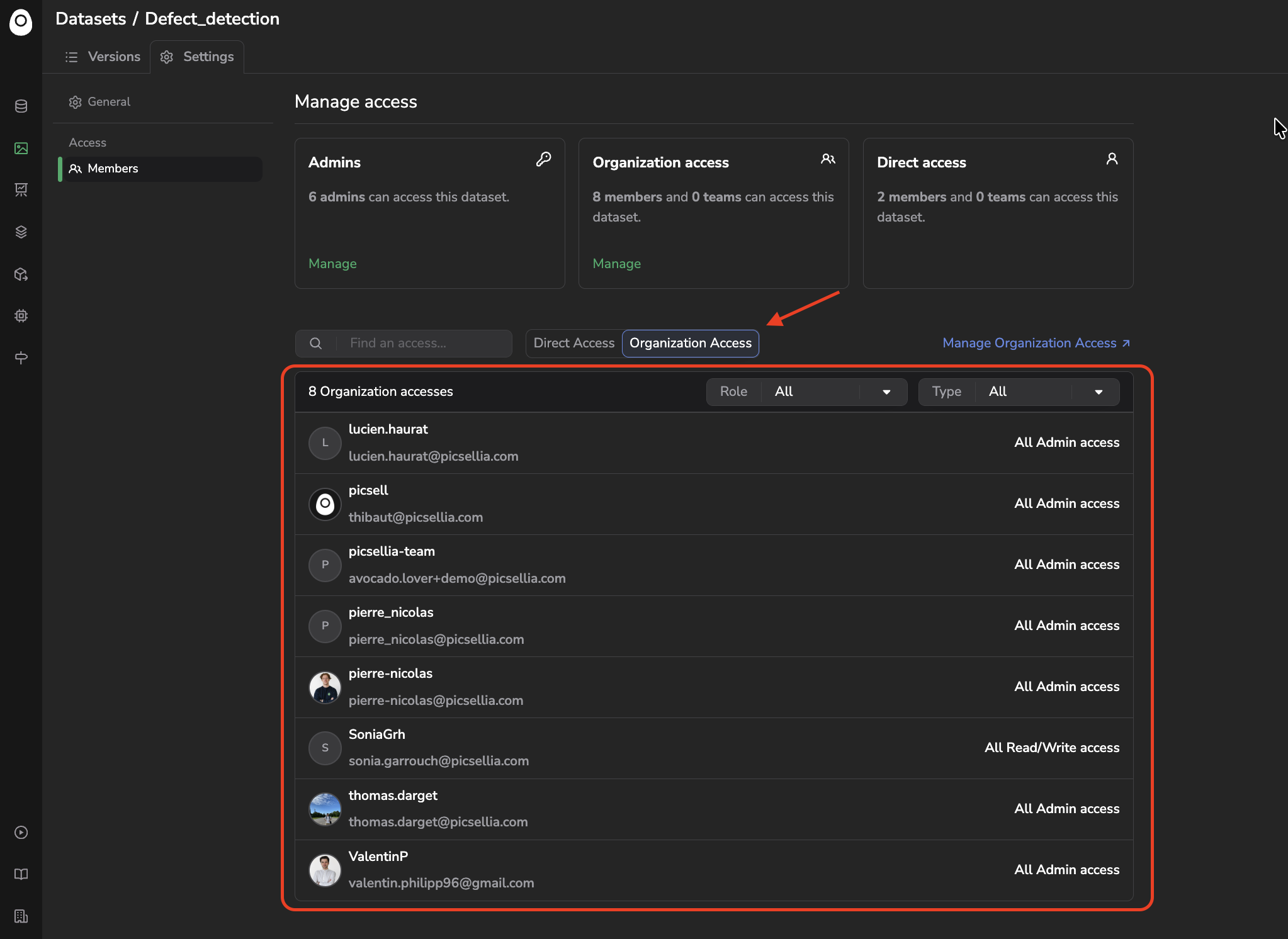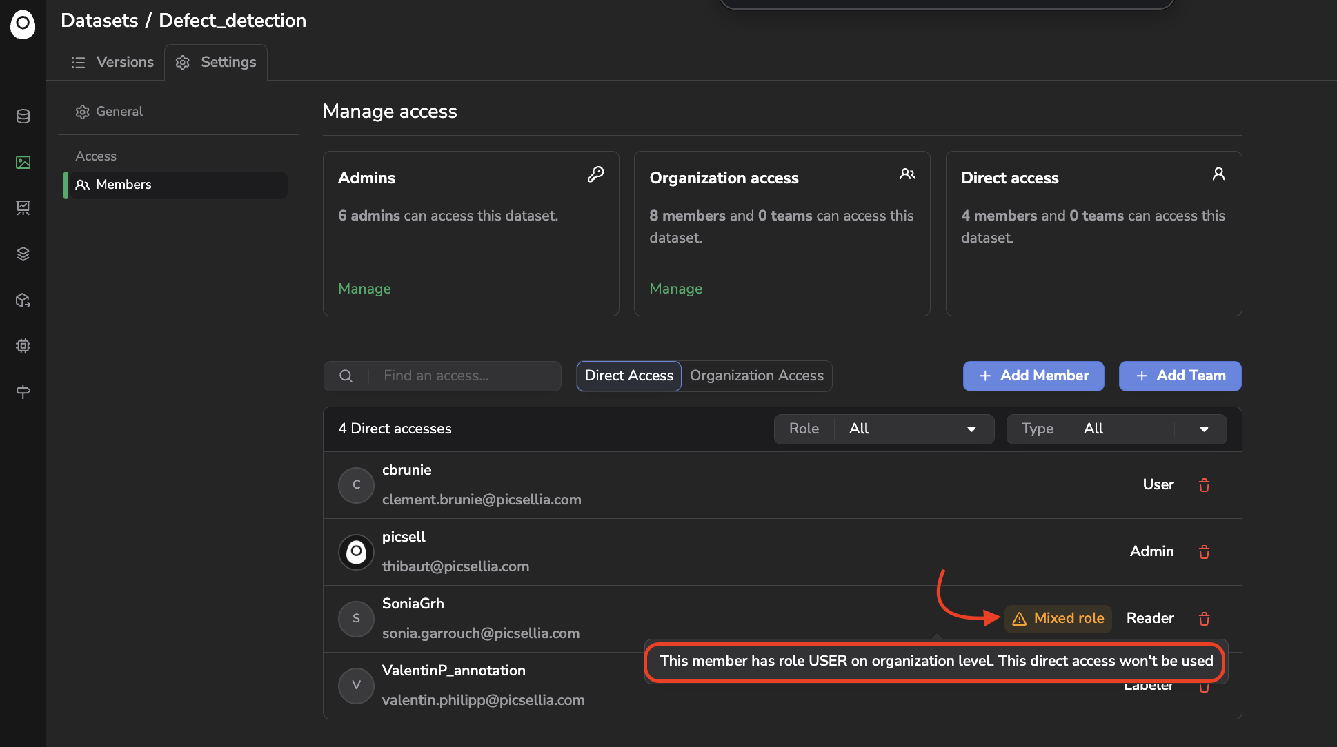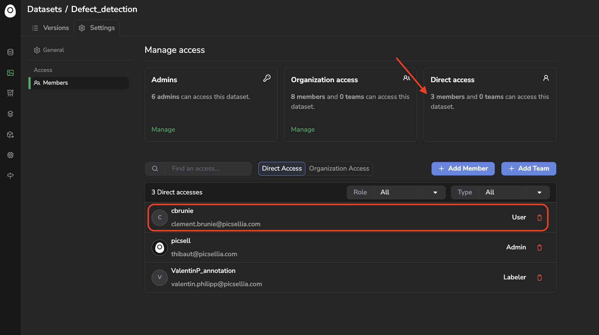 That said, in some cases you would need to give access to a Member to only some of the Dataset among all the ones in your Organization. Also let's consider that your Organization Right is User, but your Organization Access on the Dataset resource type is None, meaning that you would be able to create a Dataset (thanks to your Organization Right) but not even to read it, due to your Organization Access. To avoid such cases, the Picsellia User Management system allows you to provide a Direct Access to some specific objects.