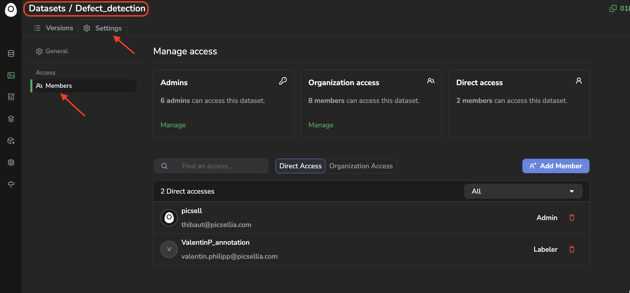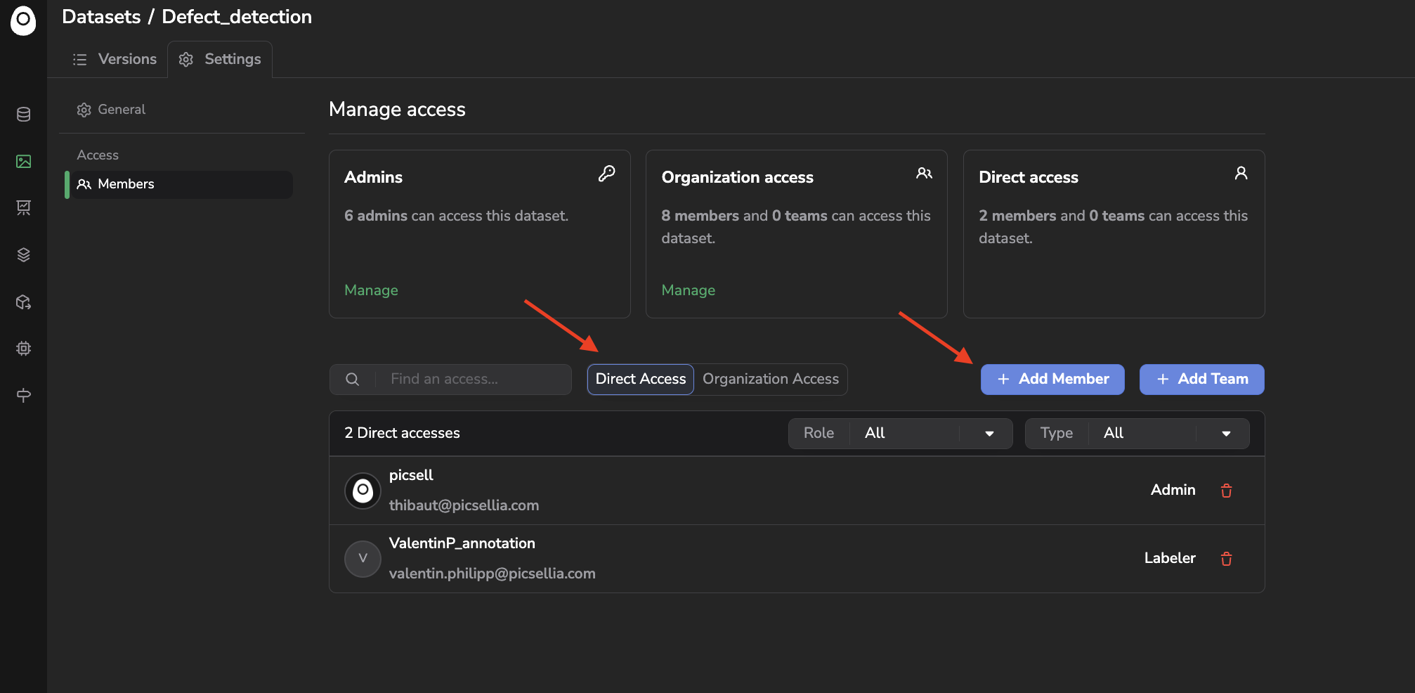 The Direct Access mecanism, allows a Member to be granted a higher right then the one granted though the Organization Access for a particular Picsellia object.