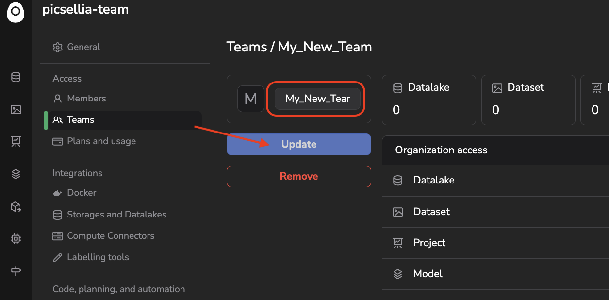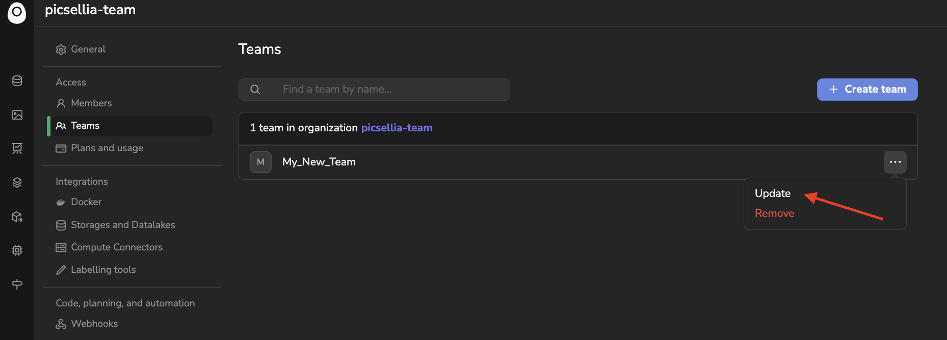 Once created, you can click on Update to access the Team management page that will allow you to populate the Team with existing Members and define its permissions and access.