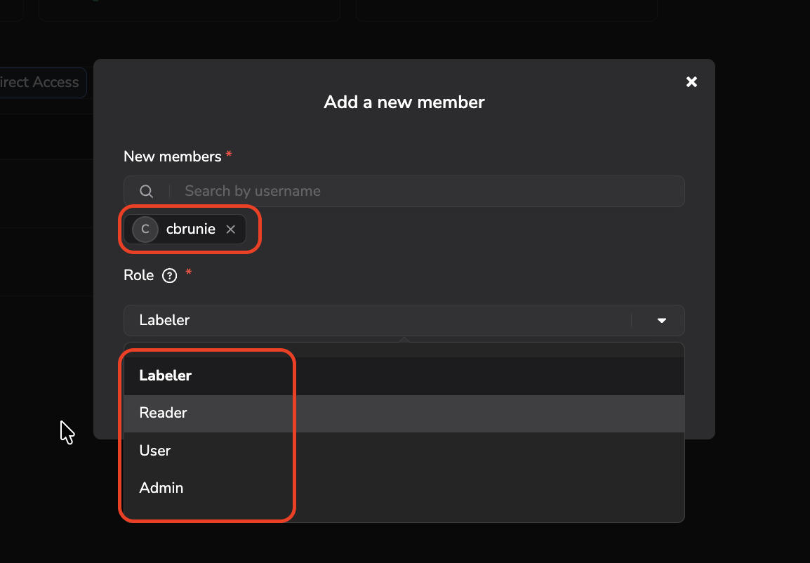 Then you will be able to type the usernames of the Members that you want to give a Direct Access to and define their associated role on the current resource: