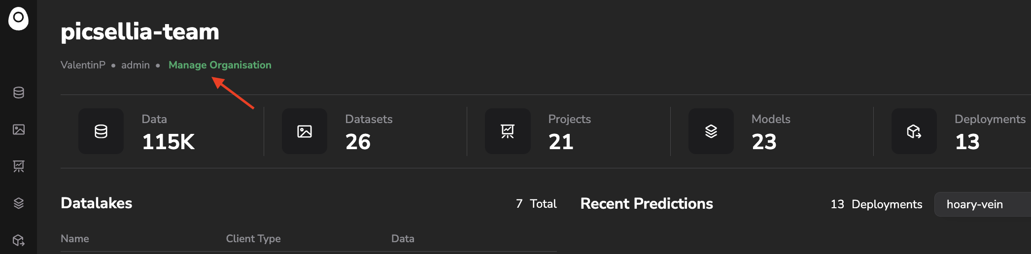 - A Member with an Admin Organization Right will always be able to create any of these Picsellia resources. This Member will have the Admin Organization Access on all the resource types, and this right cannot be downgraded; as a consequence, the Member will always have access to all the existing resources without exception. The Admin Organization right also provided access to the Organization Settings tab.