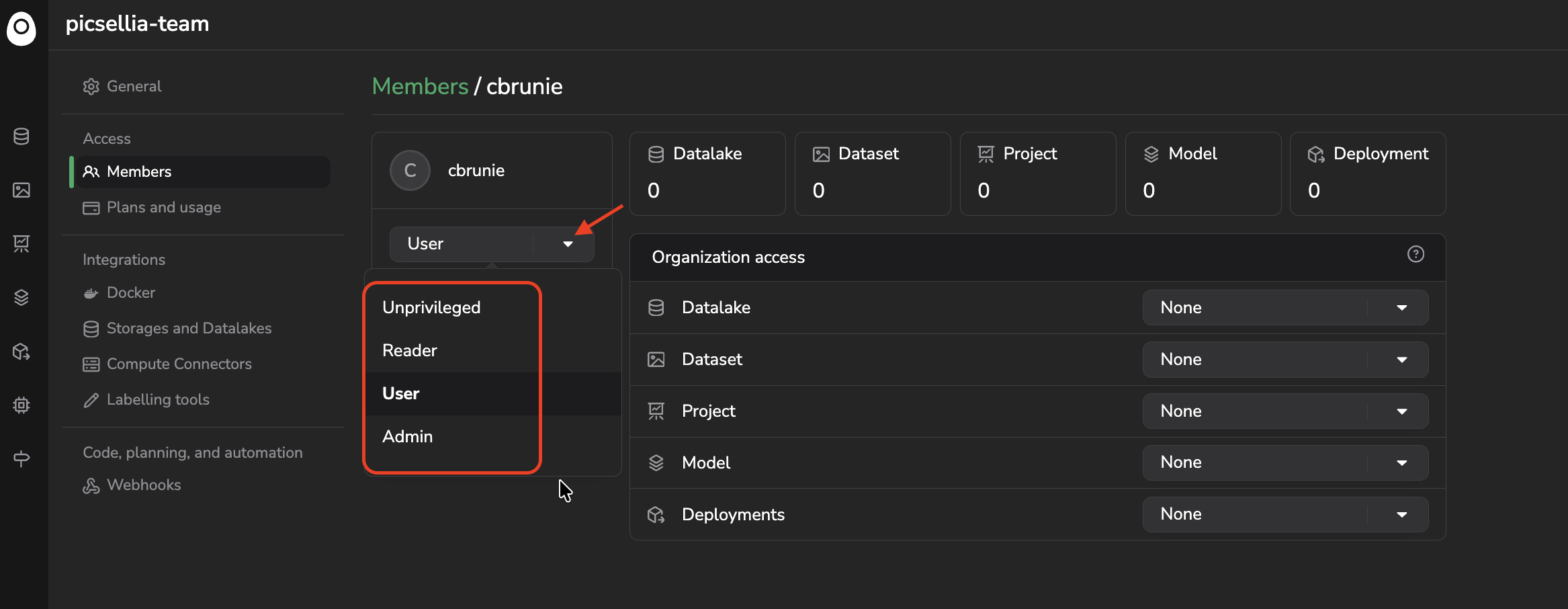 - A Member with an Unprivileged Organization Right is not able to create any of these Picsellia resources. Moreover, a Member with an Unprivileged Organization Right won't be able to access any other feature than Campaign (in which he will be able to list all the Annotation Campaigns he is involved by getting Tasks assigned) meaning that this Member won't be able to access any Picsellia resource this is why his Organisation Accesses are setup as None without any edition possibility. The Unprivileged Organization Right doesn't provides the access to the Organization Settings tab. More details on the Annotation Campaigns and the Unprivileged role are available here.