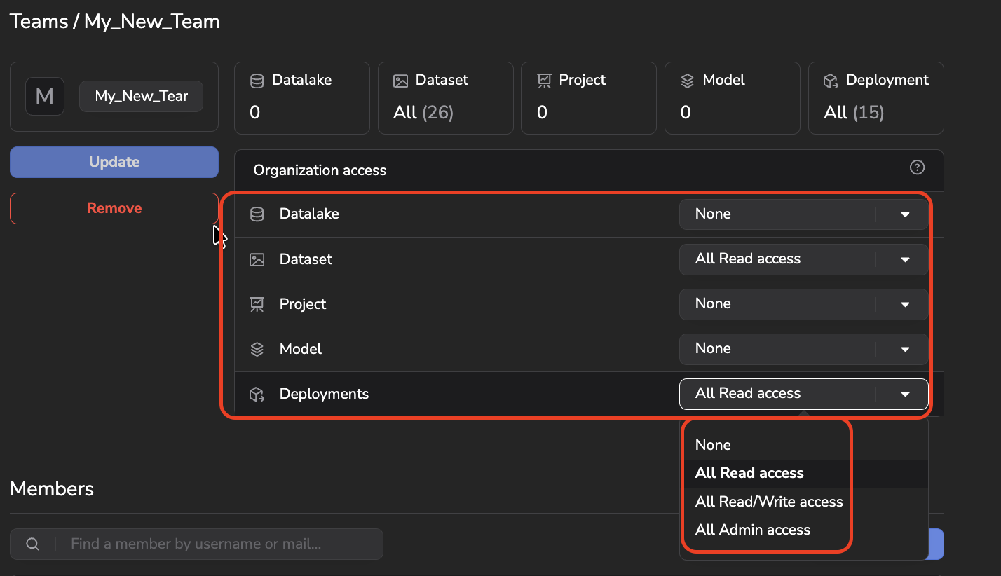 Contrary to the Organization Right, the Organization Accesses can be defined per resource type, which means that for each Member you can define a given Organization Access for the existing Datalake, Dataset, Project, Model and Deployment.